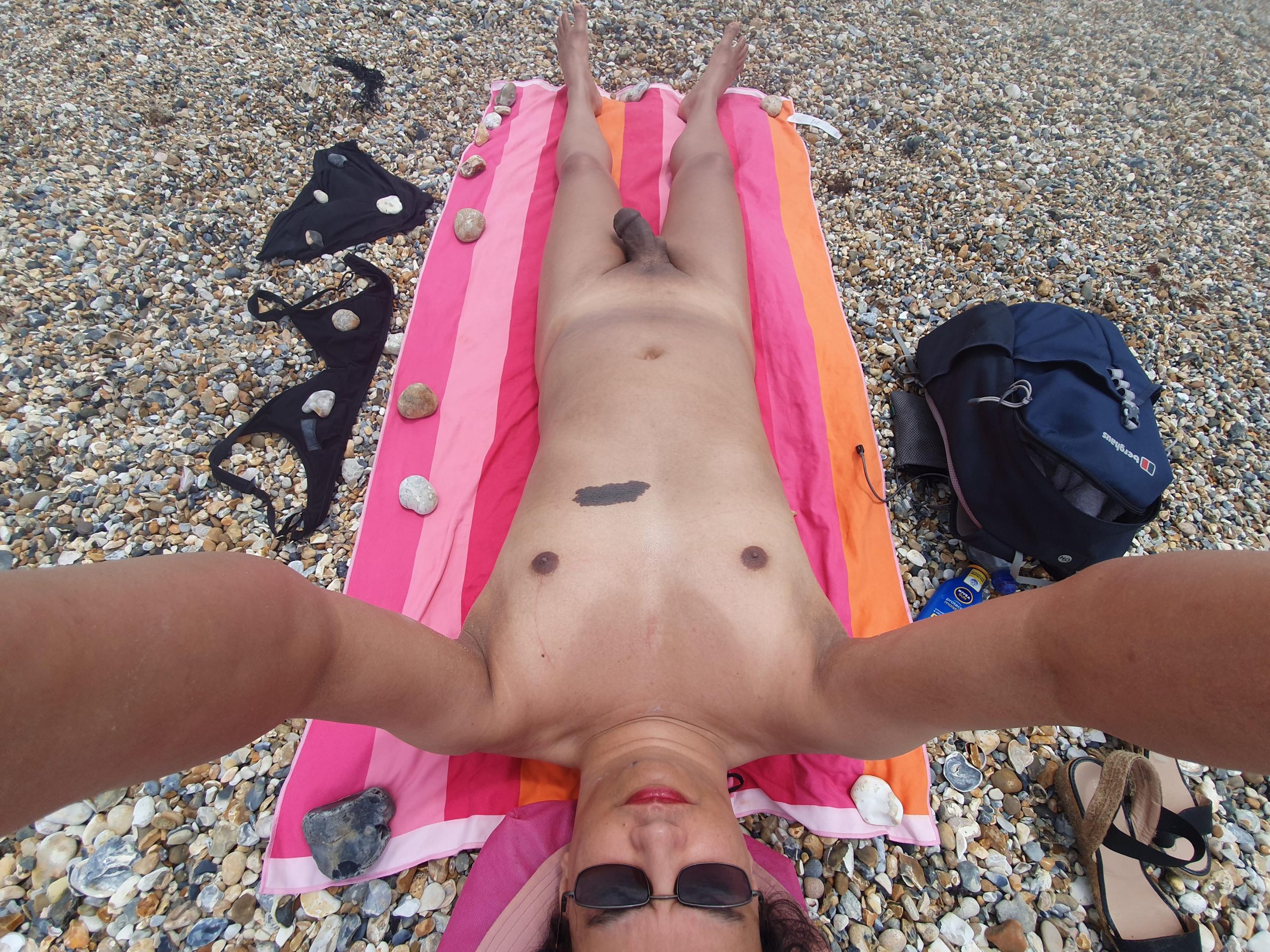 Naked on the beach with my bikini and tan-lines after a dip in the sea.