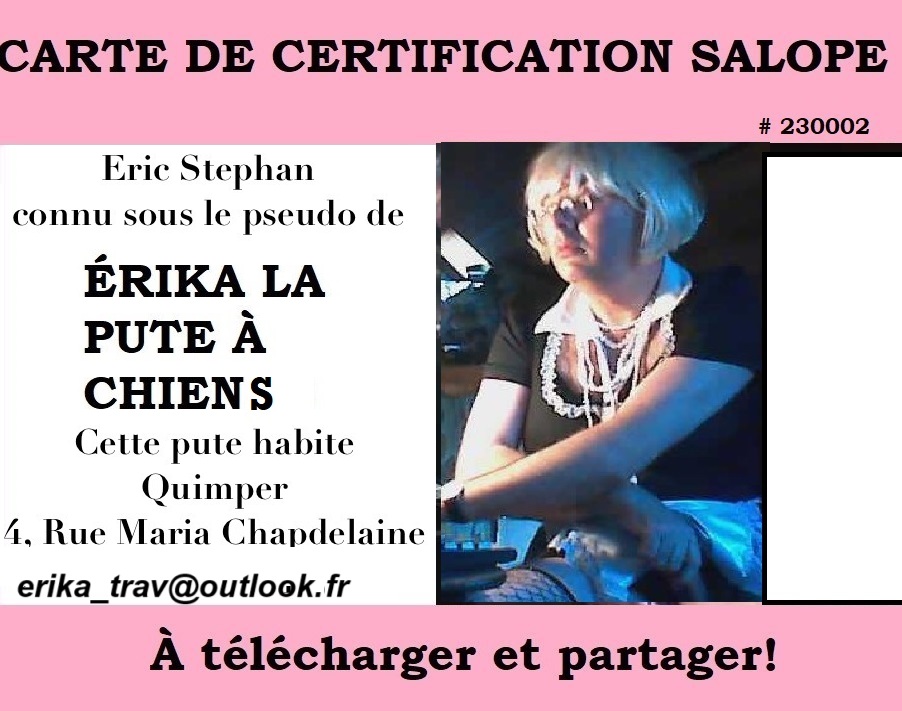 est ce que vous savez que cette pute de erika est zoophile depuis tres longtemps et que bon nombre de chiens lui sont passés dessus…….elle en veut encore plus et passer a des gros chiens