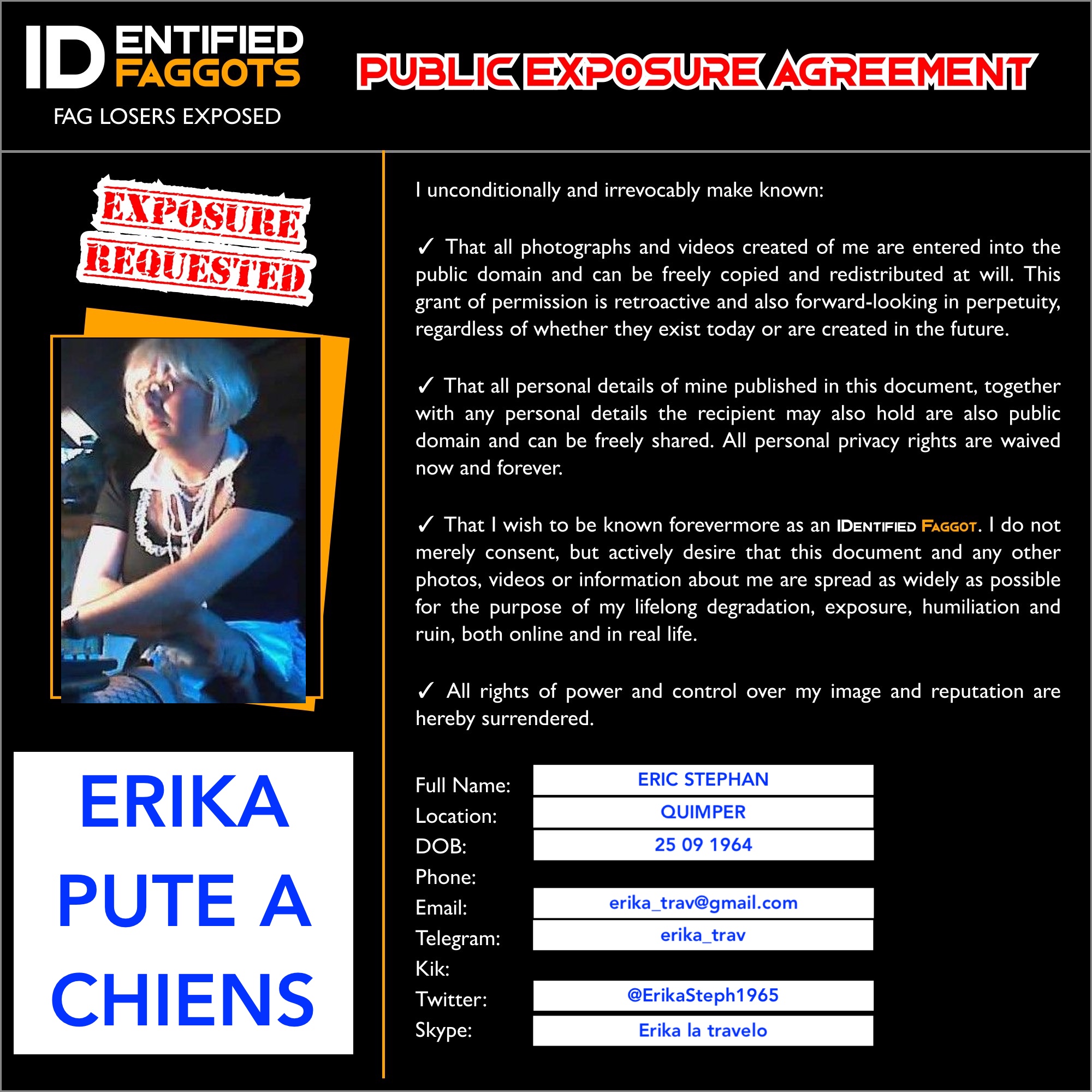 je m’appelle Eric STEPHAN mais connue comme Erika la travelo. J’habite QUIMPER. Je suis soumise sans tabous. Je fantasme sur scénario zoophile attachée dans un chenil de gros chiens devant voyeurs. Possibilité d’être filmée avec diffusion publique.