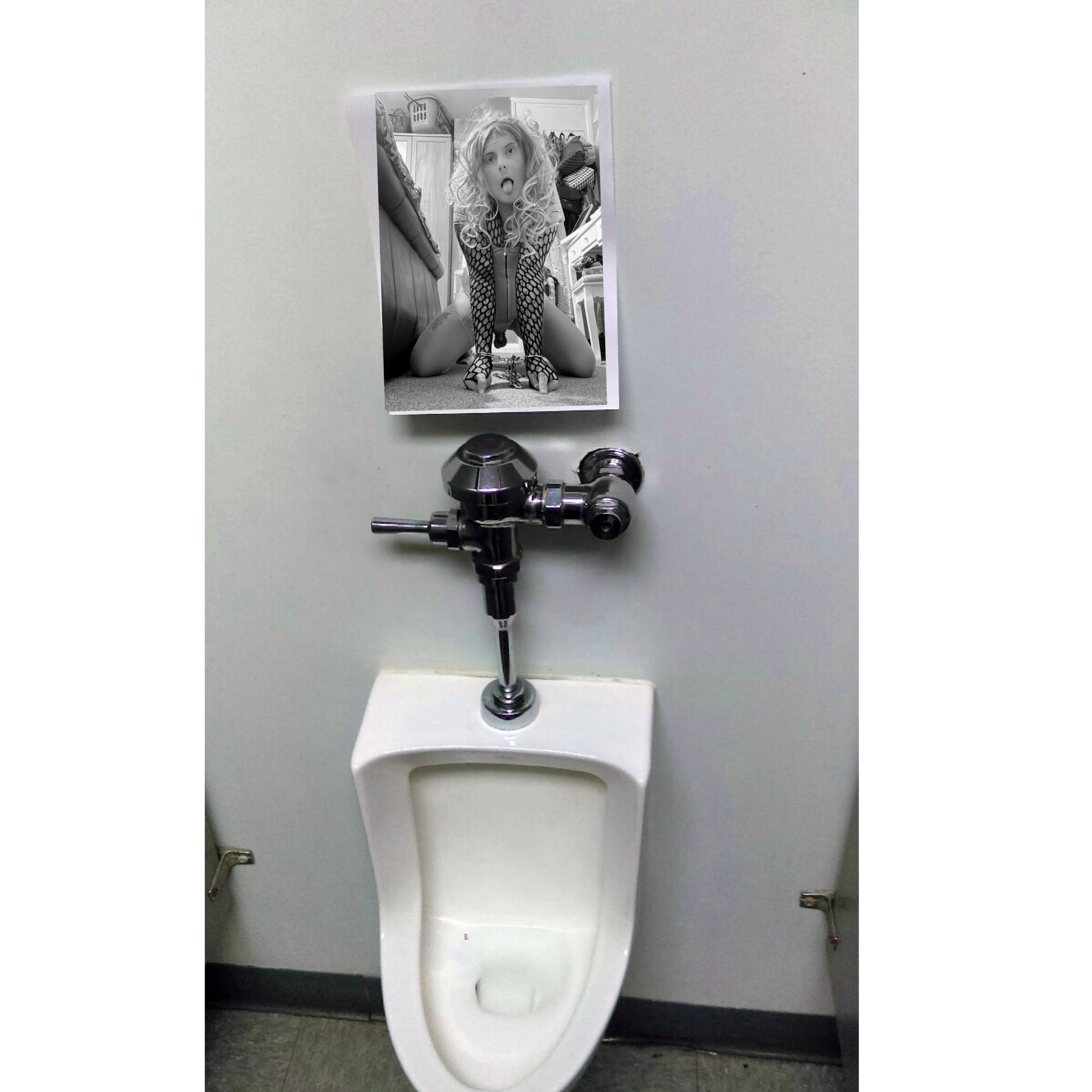Jessie the sissy slut, exposed in a bar above the gross urinals for all the guys to see her and find her for sex.